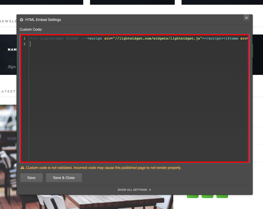4. Paste your code from Lightwidget inside the dialog box